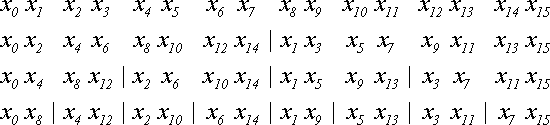Рассмотрим двоичное представление номеров элементов и занимаемых ими мест. Элемент с номером 0 (двоичное 0000) после всех перестановок занимает позицию 0 (0000), элемент 8 (1000) - позицию 1 (0001), элемент 4 (0100) - позицию 2 (0010), элемент 12 (1100) - позицию 3 (0011). И так далее. Нетрудно заметить связь между двоичным представлением позиции до перестановок и после всех перестановок: они зеркально симметричны. Двоичное представление конечной позиции получается из двоичного представления начальной позиции перестановкой битов в обратном порядке. И наоборот.