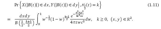где B(α, β) означает бета-функцию с параметрами α, β, а B(t), t > 0 – стандартное броуновское движение, не зависящее от (X(t), Y (t)). Это означает, что движение на плоскости с броуновским временем может быть рассмотрено как броуновское движение на плоскости с собственным вероятностным распределением, обладающим свойствами бета-распределения, зависящего от количества изменений направления.