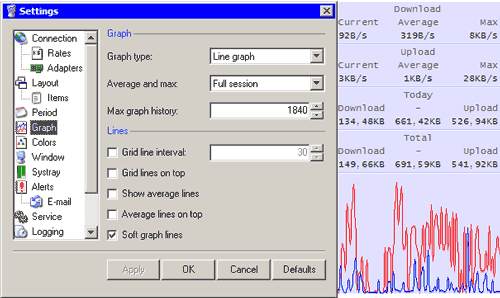 Её разработчики очень много внимания уделили настройке окна мониторинга трафика. Во-первых, можно определить, какую именно информацию программа будет постоянно показывать на экране. Это может быть количество полученных и переданных данных (как отдельно, так и в сумме) за сегодня и за любой указанный промежуток времени, среднюю, текущую и максимальную скорость соединения. Если у вас установлено несколько сетевых адаптеров, вы можете следить за статистикой для каждого из них отдельно. При этом, нужная информация для каждой сетевой карты также может отображаться в окне мониторинга.
