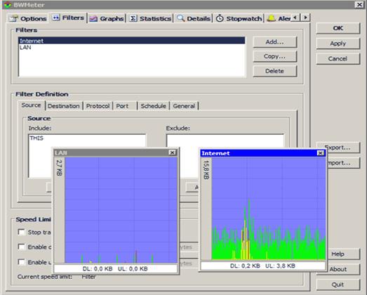 Программа имеет гибкие настройки для мониторинга трафика. С ее помощью можно определить, нужно ли следить за приемом и передачей данных в Интернет только с этого компьютера или со всех компьютеров, подключенных к локальной сети, установить диапазон IP-адресов, порты и протоколы, для которых будет или не будет производиться мониторинг. Кроме этого, можно отключить слежение за трафиком в определенные часы или дни. Системные администраторы наверняка оценят возможность распределения трафика между компьютерами в локальной сети. Так, для каждого ПК можно задать максимальную скорость приема и передачи данных, а также одним щелчком мыши запретить сетевую активность.
