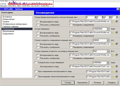 Как и коммерческие аналоги, DUTraffic может выполнять разнообразные действия при выполнении тех или иных условий. Так, например, он может проигрывать аудиофайл, показывать сообщение или же разрывать соединение с Интернетом, когда средняя или текущая скорость загрузки меньше заданного значения, когда продолжительность Интернет-сессии превышает указанное число часов, когда передано определенное количество данных. Кроме этого, различные действия могут выполняться циклически, например, каждый раз, когда программа фиксирует передачу заданного объема информации. Статистика в DUTraffic ведется отдельно для каждого пользователя и для каждого соединения с Интернетом. Программа показывает как общую статистику за выбранный промежуток времени, так и информацию о скорости, количестве переданных и принятых данных и финансовых затратах за каждую сессию.