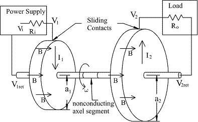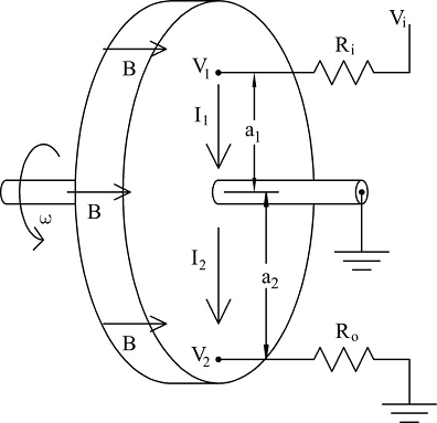 Простейшая изолированная модель dc-трансформатора состоит из 2-х проводящих дисков с радиусами a1 и a2, вращающихся с угловой скоростью ω в однородном магнитном поле B, как показано на рис.1. Узловые потенциалы соединены с подвижными контактами на кромках дисков, а отводы присоединены к двум изолированным друг от друга полуосям. В более простом случае, если потенциалы не должны быть изолированы, будем рассматривать модель с одним диском, изображенную на рис.2; в этом случае контакты находятся на боковой поверхности диска. В этом случае можно без потери общности положить V1,ret = V2,ret = 0.