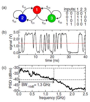 хаосом и таблица истинности для логических операций, выполняемых узлами 1, 2 (XOR), и 3 (XNOR);