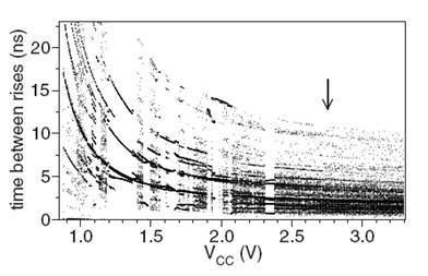 обнаружили, что динамика цепи зависит от напряжения питания VCC логических элементов, которое